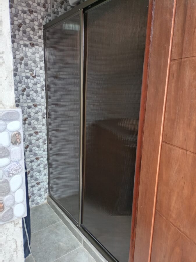 Estructura de Aluminio en color bronce (CAFE) al igual que el policarbonato Sellado con silicona transparente . El box es frontal, los corte de la estructura como los bastidores de las puertas se preparo en el taller para posteriormente ir a la instalación.