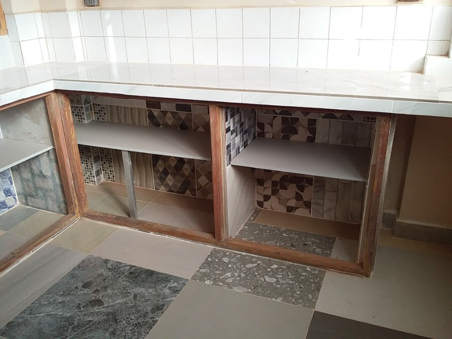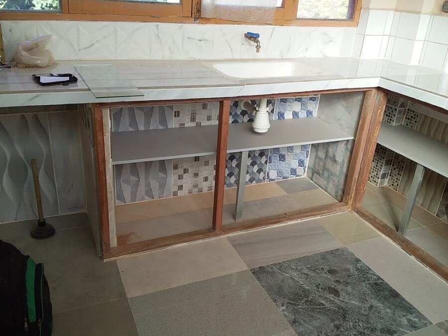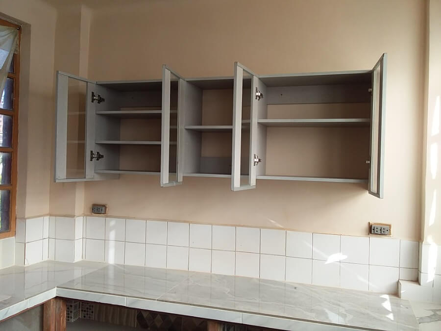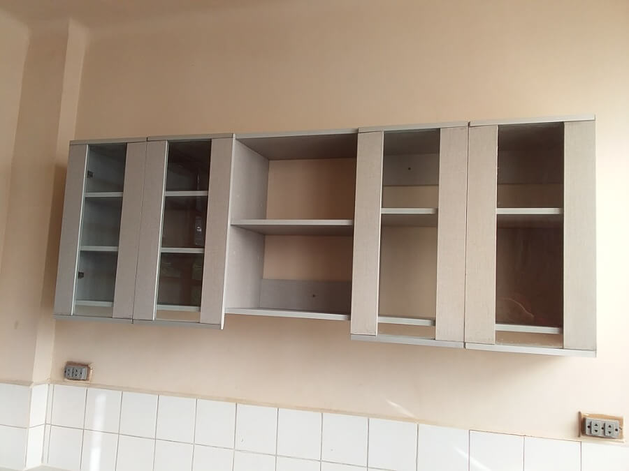 Este proyecto se realizo un mueble alto con puertas batientes con cierre lento convinadas xon Vidrio y Aluminio a loos extremos y el centro libre de puestas. En la parte baja solo se aumento repizas reforzadas con columnas de aluminio en la parte central para reforzar la aujecion que tiene en los laterales y fondo..