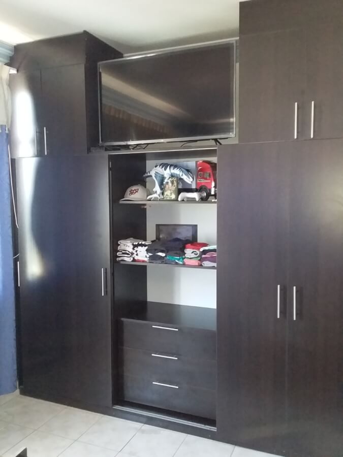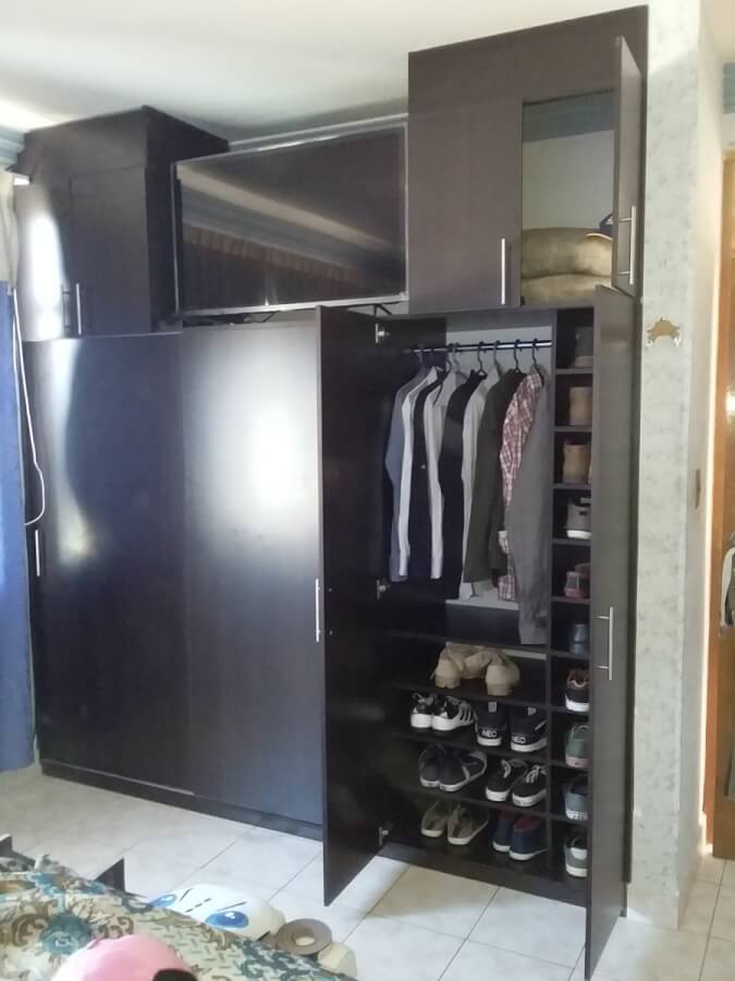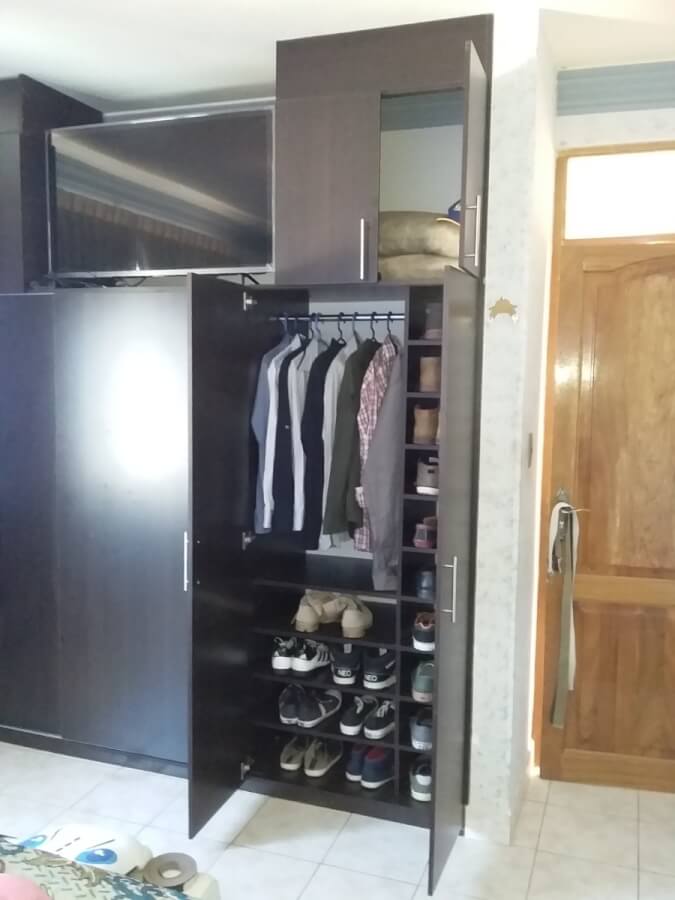 PROYECTO EN LA ZONA SUR DE COCHABAMBA, DL MISMO TIENE 4 CUERPOS UNO PARA ROPA DE COLGAR, OTRA PARA DOBLAR,CAJONES CON RIELES TELESCOPIO UN AREA DE ZAPATOS, EN LA PARTE ALTA TIENE MALETEROS Y UN AREA PARA TV. PUERTAS BATIENTES Y CORREDIZAS CON JALADORES DE CALIDAD I DURACION.